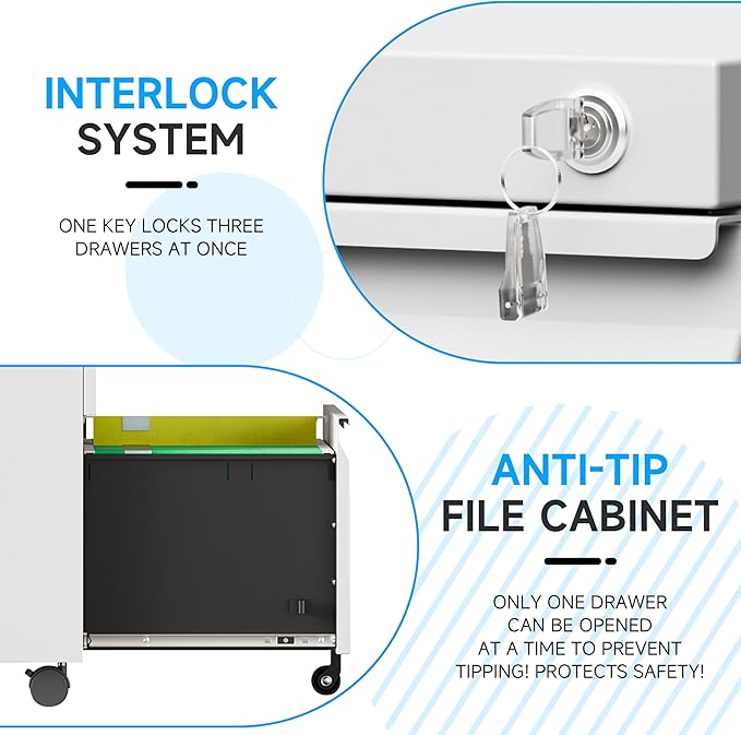 - 【ANTI-TIPPING THOUGHTFUL DESIGN】Our locking filing cabinets are equipped with 5 sturdy casters to make it easy to move the cabinets to different positions. 2×360° easy swivel casters + 2×lockable casters + 1×anti-tipping caster. Always ensure stability and prevent the file cabinet from tipping over accidentally