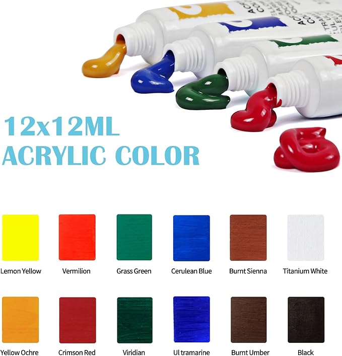 - What You Can Get: Falling in Art tabletop easel set includes 12 colored pencils, 12 colors acrylic paints, a desktop easel, 10 paintbrushes, 4 canvases, a palette, a watercolor pad, an apron, and a color wheel. The painting easel kit is designed to cater to a myriad of your artistic needs, enabling you to enjoy your journey.