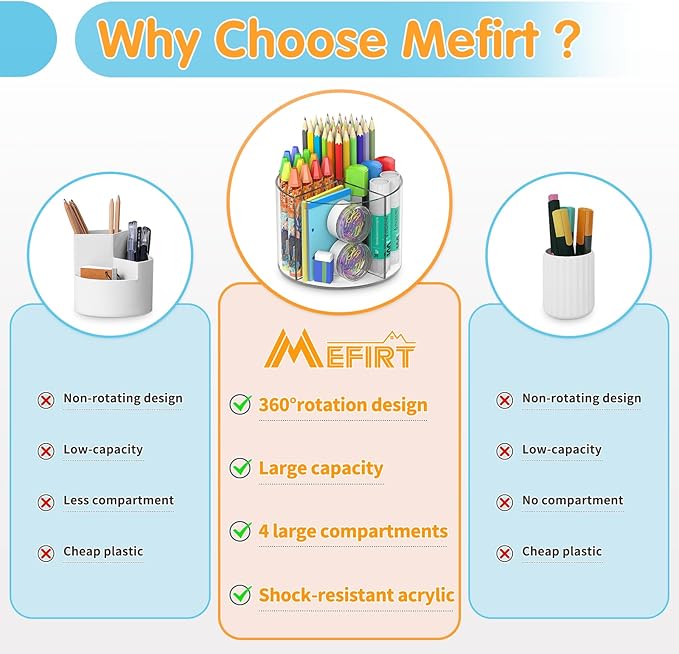 - 360°Rotating Design Pen Organizer: This desktop organizer can be turned to 360-degree rotation, so you can quickly and easily get what you want. Mefirt acrylic desk organizer lets you keep all your things within reach. The 360-degree rotation saves time when looking for your items and helps maintain the tidiness and organization of your desk.