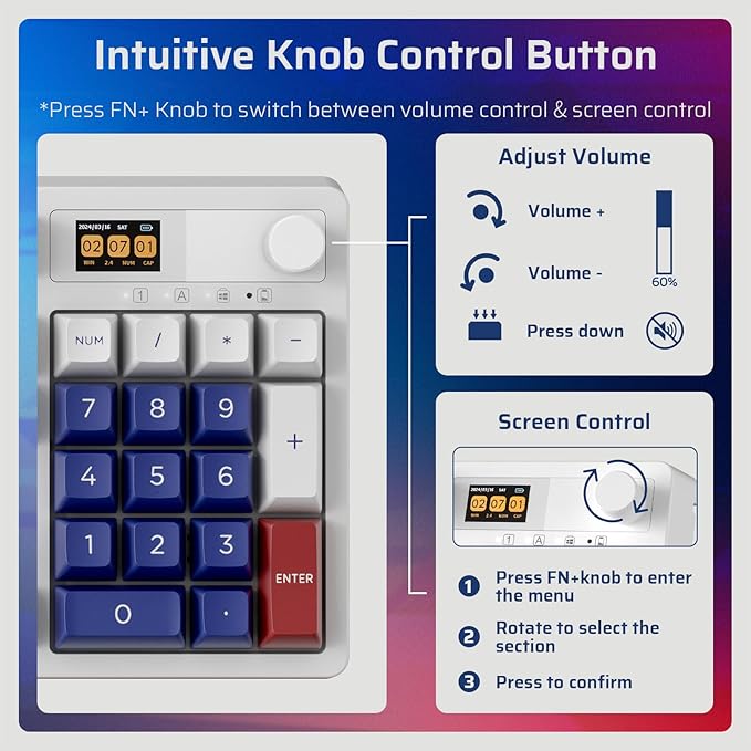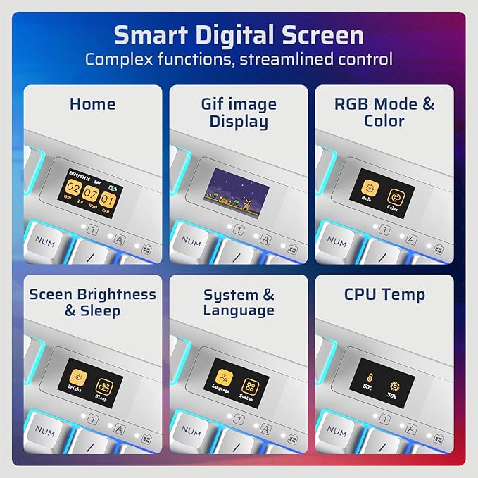 - Compact Screen, Infinite Possibilities — Elevate your control experience with our multifunctional display screen. The keyboard with screen could showcase GIF images, time, battery status, switch WIN/MAC layouts, adjust lighting effects, color, speed and monitor CPU status, etc.