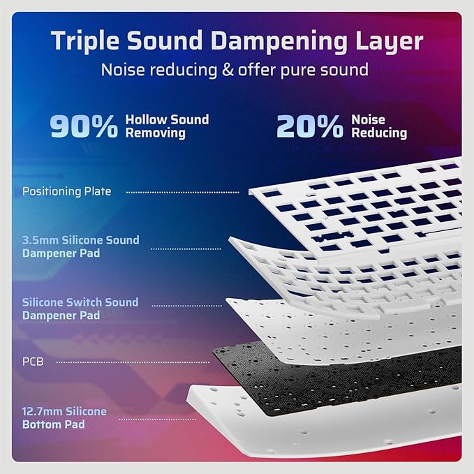 - Creamy sounding Keyboard — Triple-Layer silicone dampening structure significantly minimizes hollow sounds and cavities noise, delivering a super smooth and quiet typing experience. Complemented by oil-resistant PBT keycaps for enhanced typing comfort.