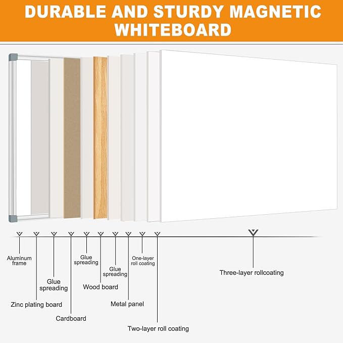 - PREMIUM MAGNETIC DRY ERASE BOARD: Crafted with a specially lacquered surface for a smooth and durable writing experience, our magnetic dry erase board boasts high-quality construction. The robust silver aluminum frame is scratch-resistant, and the ABS plastic corners with secure screw-fixing ensure safety and long-lasting durability. The detachable marker tray keeps writing essentials within reach, emphasizing convenience and safety without any sharp edges.