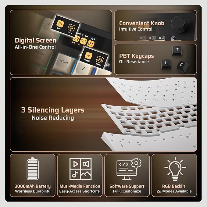 - Creamy sounding Keyboard with Screen — Triple-Layer silicone dampening structure significantly minimizes hollow sounds and cavities noise, delivering a super smooth and quiet typing experience. Complemented by oil-resistant PBT keycaps for enhanced typing comfort.