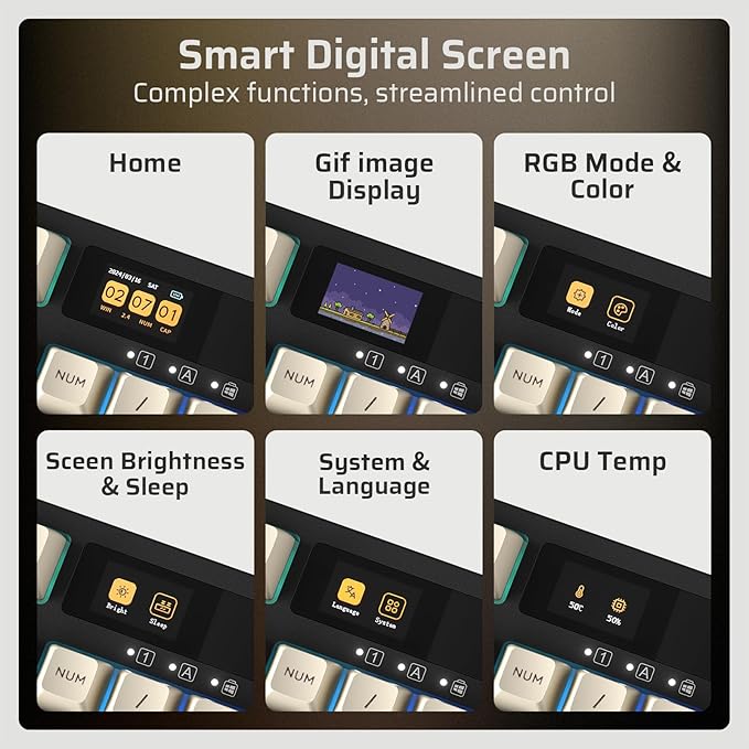 - Compact Screen, Infinite Possibilities — Elevate your control experience with our multifunctional display screen. The keyboard with screen could showcase GIF images, time, battery status, switch WIN/MAC layouts, adjust lighting effects, color, speed and monitor CPU status, etc.