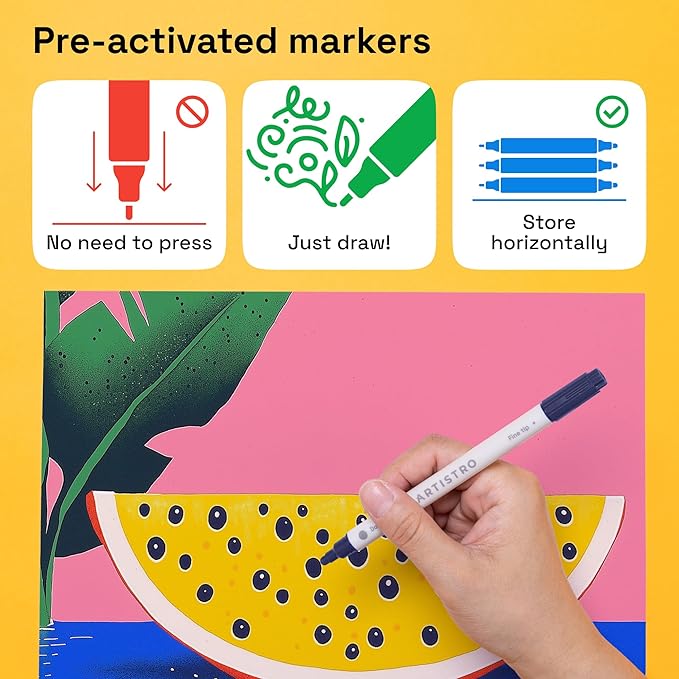 - Convenient Horizontal Storage for Longevity – Store markers horizontally with caps tightly closed to maintain ink quality and flow. This tip ensures your markers are always ready for smooth, vibrant strokes.