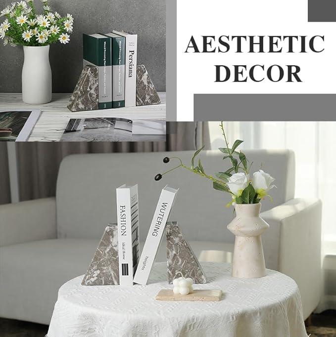Koville Marble Bookends for Shelves, Large Bookends for Heavy Books, Natural Stone Book Stopper for Books CD Movies, Aesthetic Decorative Book Ends, Bookshelf Table Home Decor(Grey)