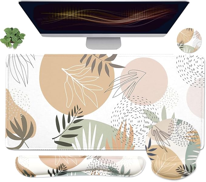 4-in-1 Gaming Mouse Pad Wrist Support Set,Desk Pad + Mouse Pad with Wrist Rest + Keyboard Wrist Rest + Coaster, Ergonomic Design for Home Office Study Game - Plant