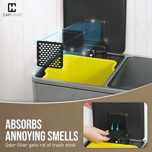 - ποΈ Odor-Free Environment - Bid farewell to unpleasant odors thanks to our innovative odor control technology. Equipped with two odor filters, one on each lid, our trash can keeps both the trash and recycling compartments fresh and odor-free. Enjoy a clean and inviting environment without worrying about unwanted smells lingering in your space, enhancing overall hygiene and comfort for you and your family.