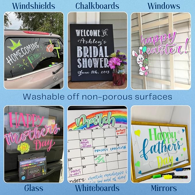 - ⭐️ GREAT FOR HOME / SCHOOL / WORK - Use MoodClue's fun, bright liquid chalk markers on auto windshields, glass, mirrors, windows, stainless steel, glassboards, whiteboards, bistro boards, LED boards and most chalkboards. Wet erase or dry erase these chalk markers from non-porous surfaces.