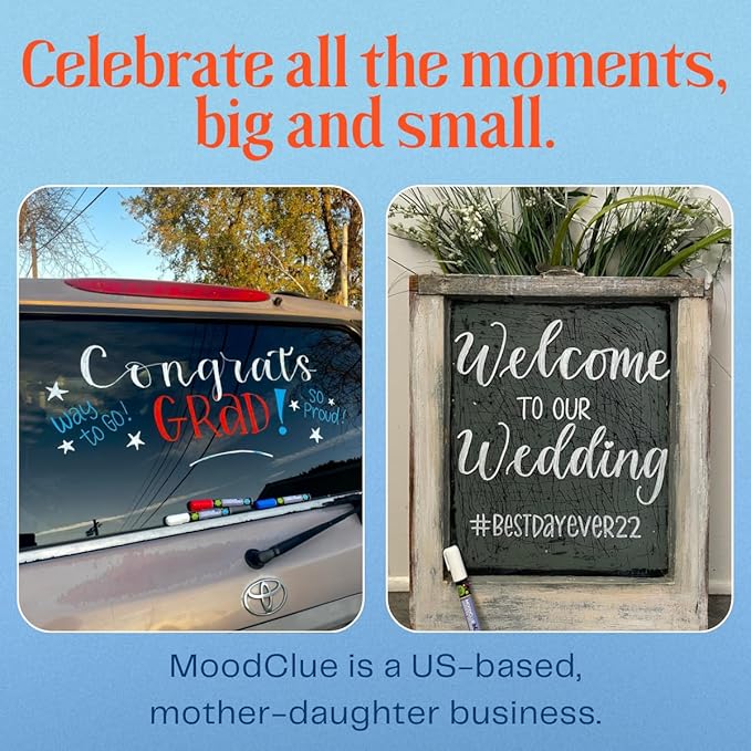 - ⭐️ GREAT FOR AUTO WINDSHIELDS + CAR WINDOWS - Decorate your car glass, windshields and mirrors. MoodClue liquid chalk marker pens are perfect for car decorating for graduation, weddings, birthdays. Auto dealerships love them too!