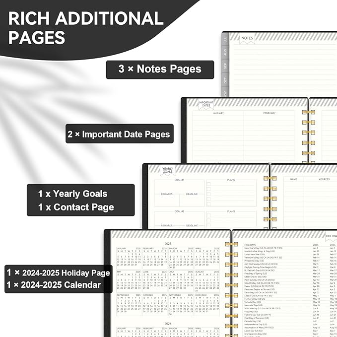 - 📒Functional 2025-2026 Planner: This academic planner can help to increase your productivity and achieve your goals. Designed from Jul.2025 - Jun.2026, featuring 12 months of monthly and weekly pages for easy year-round planning. Functionally designed additional pages including 2025-2026 calendar overview, personal information, goals and plans, important dates page, 2025-2026 holiday pages, contact pages and notes pages.