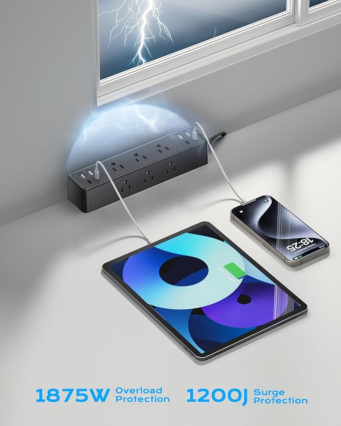 - 【17-in-1 Desk Clamp Power Strip】Multi Outlet desk power strip surge protector combines 9 AC Outlets (1875W 15A) and 8 USB Ports (4 USB-A, 4 USB-C) in a power station to provides power and charging for up to 17 electric devices.