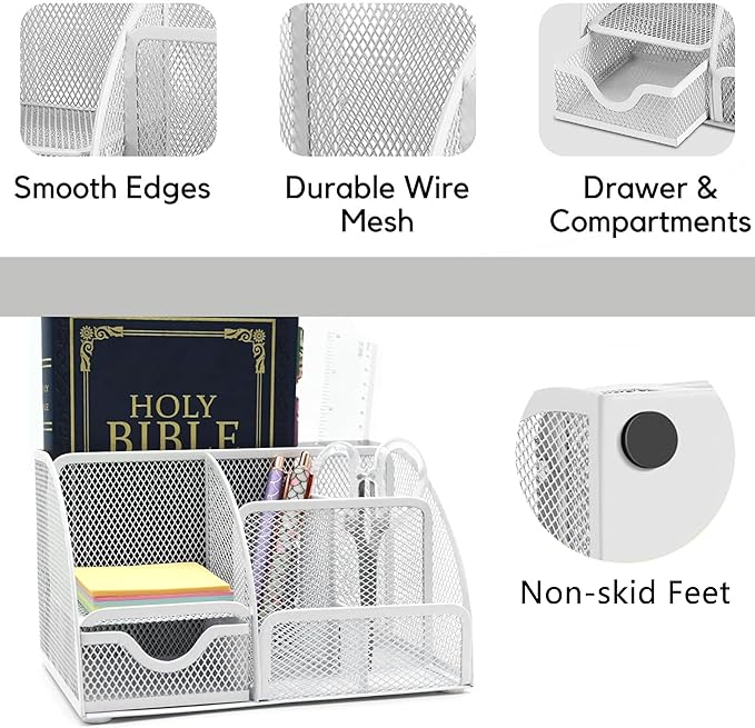 - 【Utility Desk Accessories & Workspace Organizers】 A rich combination of one multifunctional desk organizer and 11pcs cute desk accessories can meet your daily needs, keeping your desktop organized. The mesh desk organizer comes with 6 parts and 1 sliding drawer, which can be used as a cosmetic organizer or stationery organizer.