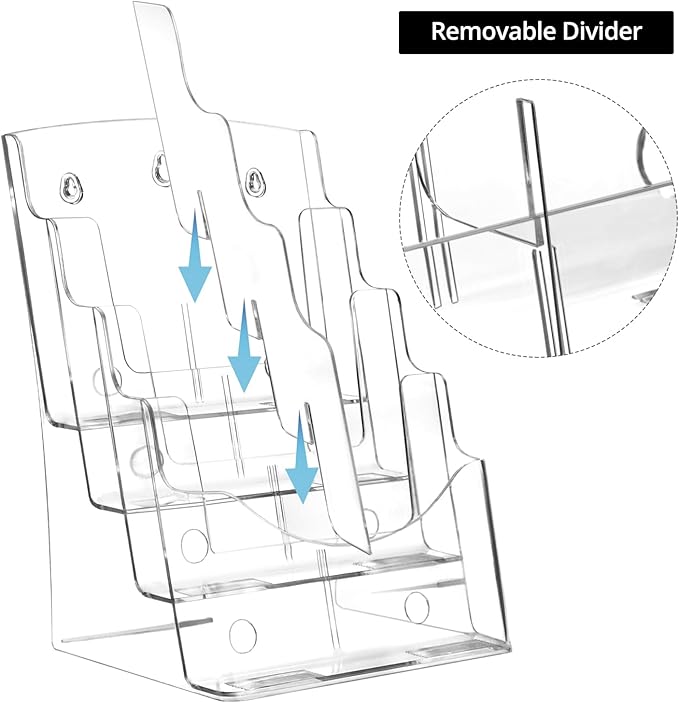 - Capacity: Features 4 tier levels with a removable divider option, allowing conversion of 4 pockets into 8, accommodating 8.5 x 11 inch materials or 4 x 9 inch brochures.