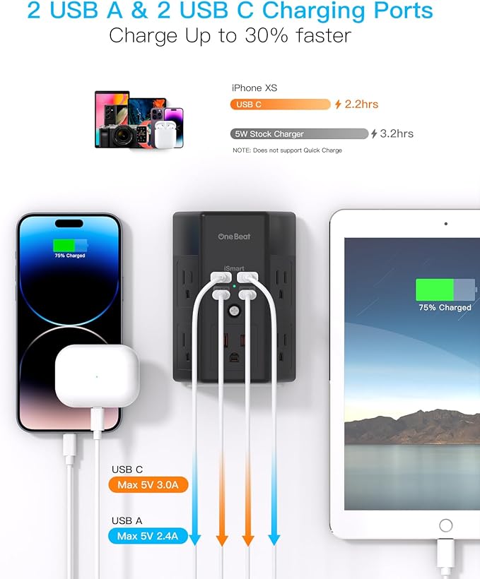- 【Multi Plug Wall Outlet 】- The plug extender total output of 4 USB ports is 5V/3.1A. Built in smart technology, the multi plug outlet can auto-detect charged devices and deliver optimum charging speed up to 5V/2.4A (max) each port, USB-C up to 3A.( Please note The UCB-C port is not Quick Charger 3.0, doesn't support any other devices which need 9~22V charging voltage.)