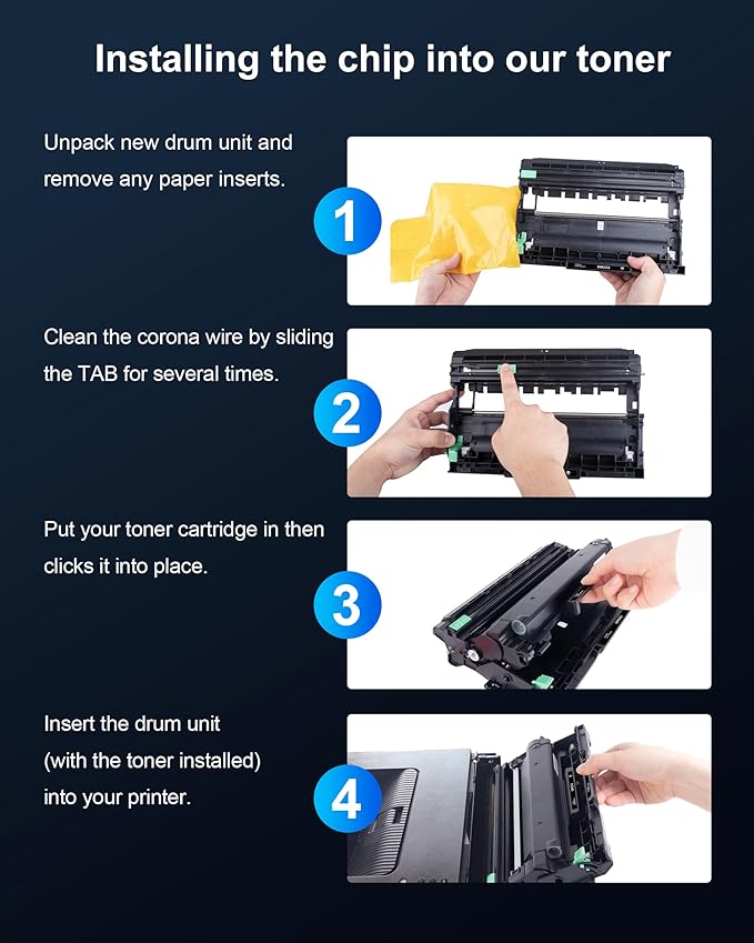- 4.Package Content: DR223CL Drum Unit Set 4-Pack Includes 1 x DR 223CL Black, 1 x DR223CLCyan, 1 x DR-223CL Yellow, 1 x DR223CL Magenta drum Unit
