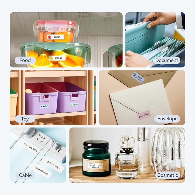- Wide Application: The label maker printing width up to 15mm with a variety of styles of label tapes, such as 12X40mm, 14x30mm, 15x30mm and more, widely used in home storage and organization, school and office file classification, and small business, such as jar stickers, food date, cosmetics, personal items, barcodes, name tags, cable identification, price tags, jewelry labels, etc. It’s also the perfect back-to-school supplies and home helper
