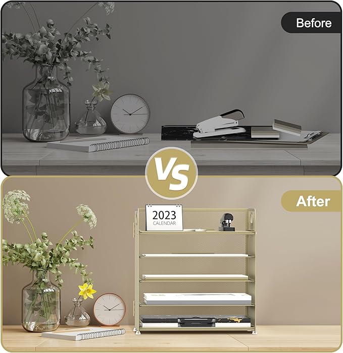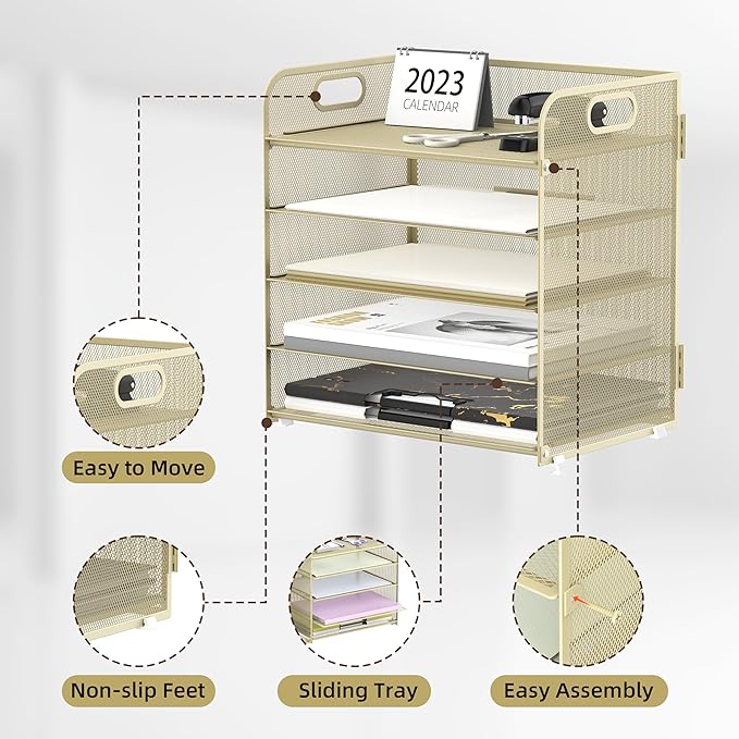 Supeasy 5 Trays Paper Organizer Letter Tray with Handle-Mesh Desk File Organizer,Pink Paper Sorter Desk Organizer for Office, Home or School (Gold Yellow)