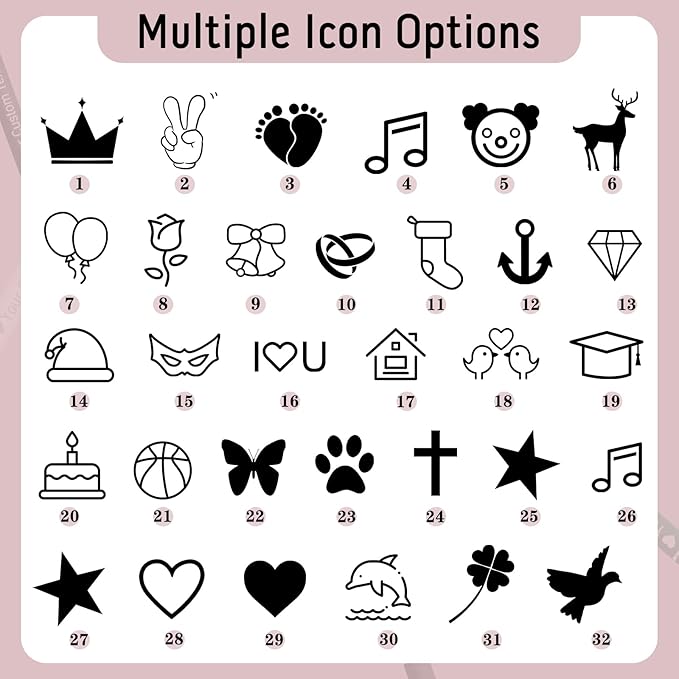 - 🌹【39 Icons Available】39 patterns are available, such as cross, ring, rose, unicorn, paw, etc. If you want to add your own logo or company logo, please send us the logo image, and we will engrave your own logo and text. All engravings are free