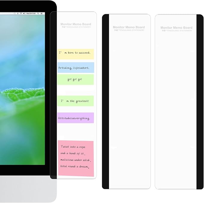 - DURABLE MATERIAL: Both side panels of the monitor are made of clear acrylic material, durable and simple fashion. The monitor note pad is easy to install, just peel off the sticker and hang it on both edges of the monitor screen. This cute desk accessory for women can be used for a long time. This computer desk accessory is waterproof and stain-resistant, with a simple and stylish look