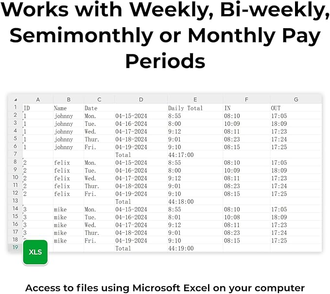 - ENSURES ACCURATE PAYROLL: Automatically detects employee attendance. Seamlessly move data from the time clock to your computer using a USB flash drive, view files with Microsoft Excel on your computer, and accommodate weekly, bi-weekly, semi-monthly, or monthly payroll cycles to suit your business requirements