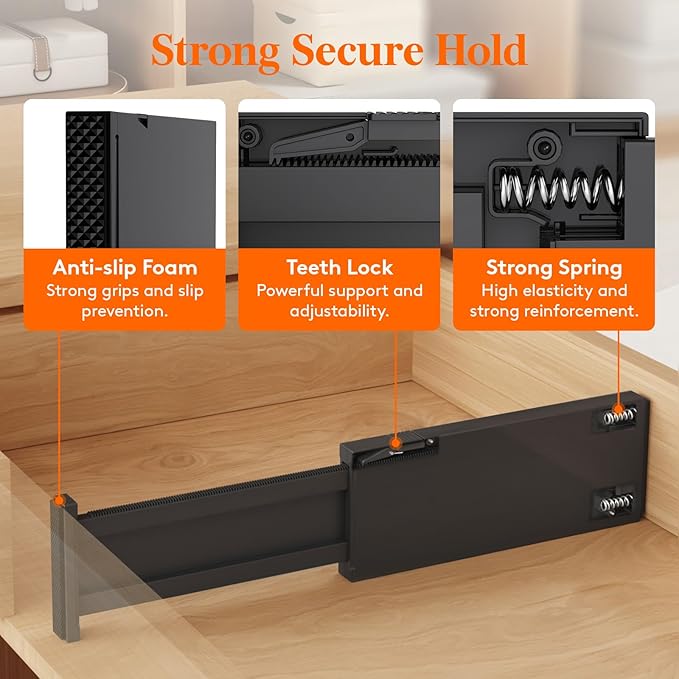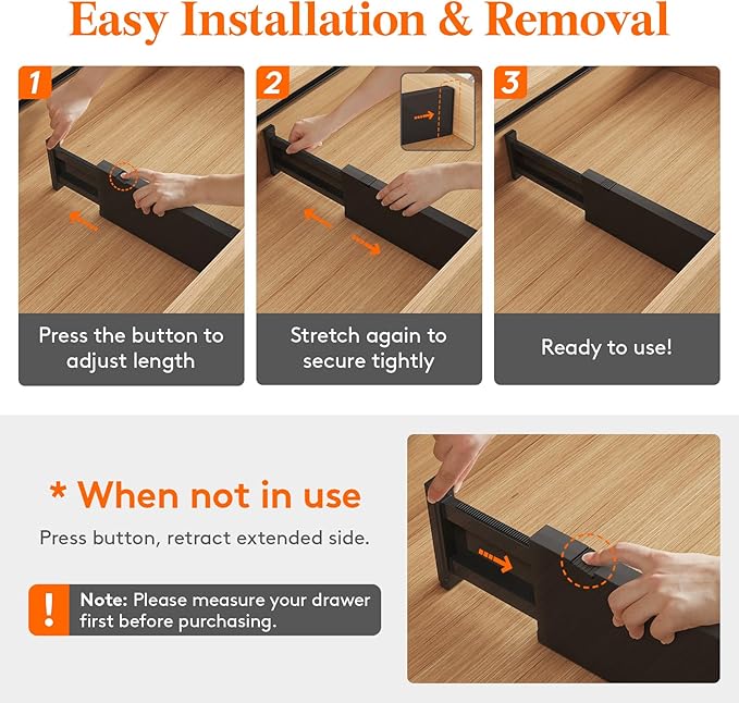- Easy to Install: To adjust the length, press the top button before placing the drawer organizer, and then stretch it out again to secure it tightly. The strong spring tension keeps each organizer upright and secure. When retracting, press the top button and push in the stretched side.