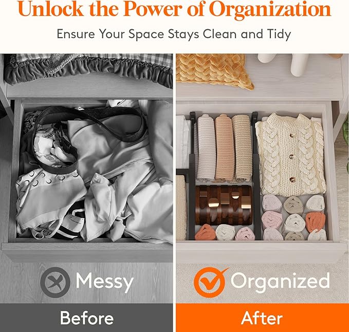 - Advanced Design: Our dresser organizer is made from stable ABS material and has high-quality EVA foam sponges at the ends to prevent scratches and damage to drawer walls, leaving no trace or residue. Additionally, our divider is patented (Patent No: US12133593B2) for a unique experience.