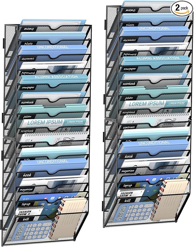 - [Multi-Purpose] JMHUD wall hanging file organizer allows you to storing paper, magazines, clipboards, file folders etc. Plus, this metal mesh holder with 14 deep pockets provides easy access to mails and documents you sort.