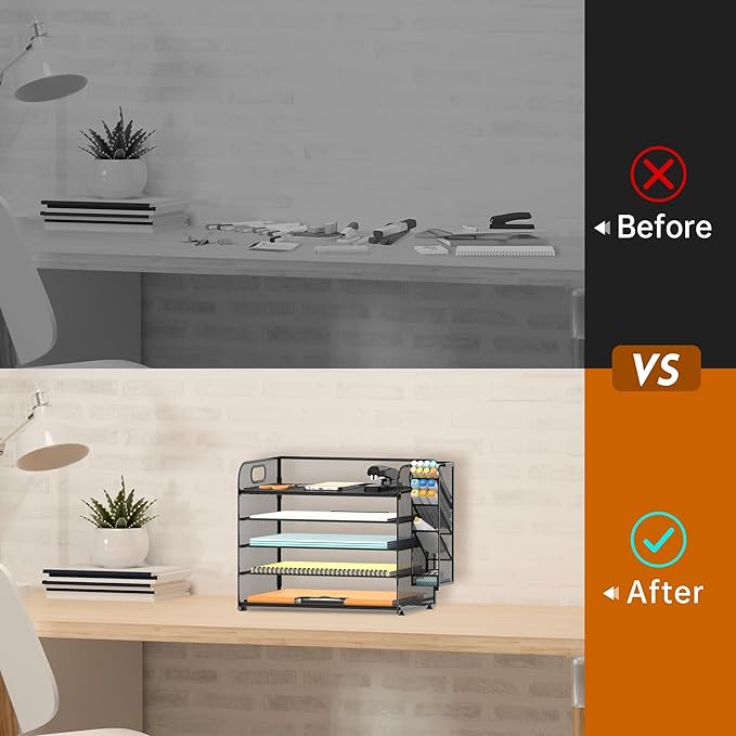 - [Mesh Steel Construction] The mesh desk file organizer is made of lightweight robust metal mesh and reinforced with a solid steel frame that makes our desk tray have long-lasting strength and reliable performance. Equipped with 4 non-slip feet, 5 tier document organizer is hard to be twisted, and its bearing capacity is strong.