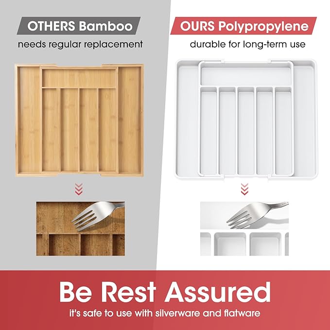 - SAFETY MEETS DURABILITY: AUJEN drawer organizer for kitchen utensils is crafted from premium PP material that is BPA-free and durable for use. Just rest assured that it can guarantee the safety of all your utensils, silverware, and flatware. Cleaning is as easy as a breeze - simply rinse with water or wipe with a damp cloth.