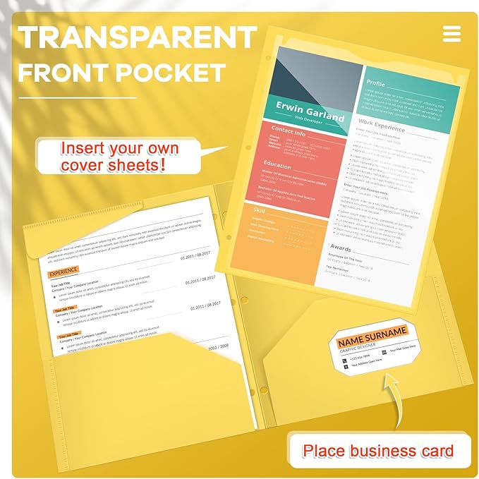 - Easy Organization: each plastic pocket folder features with 3 holes in one side, which enables you to put it into a standard 3 ring binder to organize loose documents, and clear front pocket of each folder help to store other items, giving you a comfortable using experience