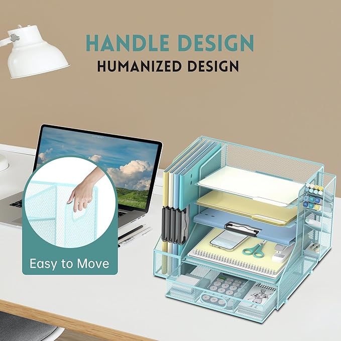 DALTACK Mesh Desk Organizer, 5-Tier Paper Letter Tray with File Holder & Pen Holder & Sliding Drawer, Desktop Organizer and Storage for Desk Accessories Office Supplies, Blue