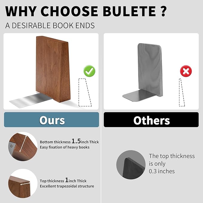 - Special Connection Technology - Combining solid wood and metal together, the connection is carefully designed by our skilled craftsmen, and the bookend of the bookshelf is not easily separated from the base, increasing the durability and stability of the wooden bookends.