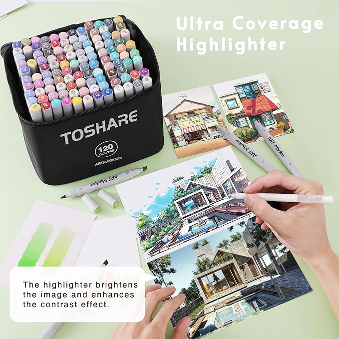 - [ 120 Vibrant Colors + 1 Highlighter Markers ] - Toshare Art Dual Tip Markers come with 120 brilliant colors and 1 multi-functional highlighter pen.Explore the full range of color with 120 dazzling shades to choose from, complemented by a highlighter pen for easy to brighten up the details of the picture,Whether you're filling a coloring book or creating a professional masterpiece, our brush markers will bring your work to life with every stroke.
