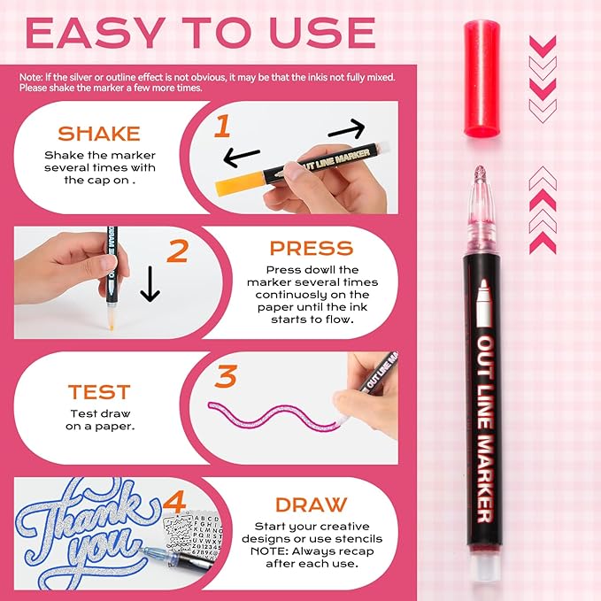 - A GREAT GIFT IDEA - Brighten your loved ones' day with these metallic outline pens. These sparkle markers are a fun addition to any stationery collection, especially for Easter! Great for birthdays, graduations, Valentine's Day, and Easter gifts. They also work well for St. Patrick's Day, Halloween, or Christmas stockings. These items suit kids, teens, artists, teachers, and students. These cute markers bring sparkle to art and crafts. They’re perfect for trending items, aesthetic school supplies, and hobbies. Use them for journaling, back-to-school supplies, or classroom essentials. They also enhance stationery sets, custom bookmarks, and decorated photo frames.