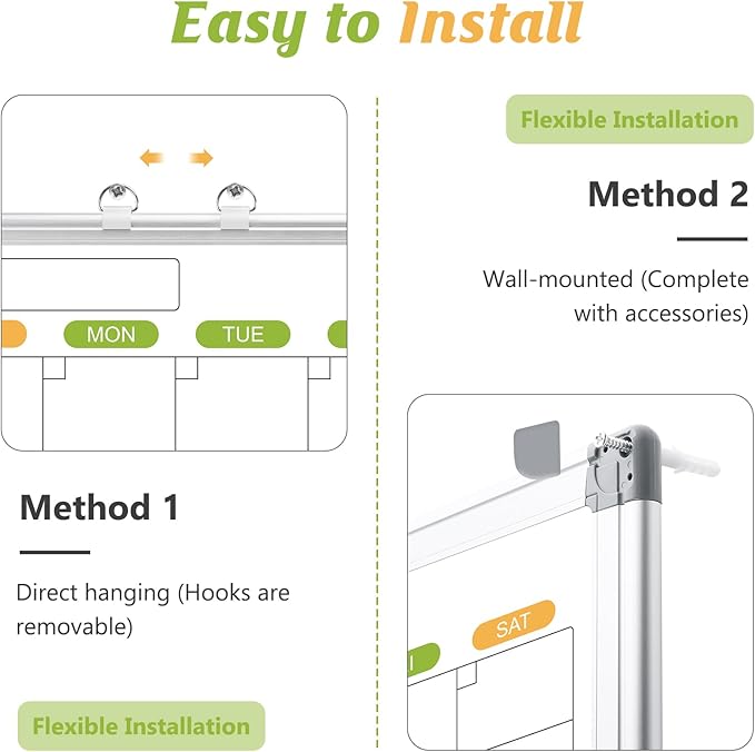 - 【2 Simple Installation Methods】: 𝑴𝒆𝒕𝒉𝒐𝒅 1 - Use the sliding hooks equipped with the calendar whiteboard for wall to hang directly to the wall; 𝑴𝒆𝒕𝒉𝒐𝒅 2: Use the screw holes on the corners of the frame to install. It comes with covers so it would look super clean with no visible screws. Installation is very simple and flexible, it can be hung horizontally or vertically according to your needs