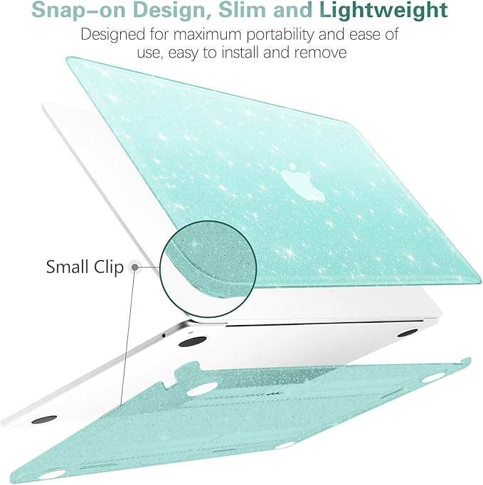- Mint Green Glitter Case Shows Off MacBook Air: This clear case with added glitter perfectly complements your device while keeping its sleek design and color, making your laptop more attractive. This highly transparent and non-yellowing case keeps your device looking new for longer. Please note that this case doesn't have a logo cutout, but it will show the logo while protecting your laptop from dust and dirt. The glitter may appear in different colors depending on the light and the laptop's color.