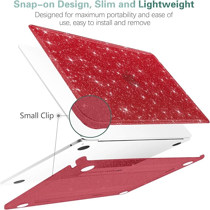 - Wine Red Glitter Case Shows Off MacBook Air: This clear case with added glitter perfectly complements your device while keeping its sleek design and color, making your laptop more attractive. This highly transparent and non-yellowing case keeps your device looking new for longer. Please note that this case doesn't have a logo cutout, but it will show the logo while protecting your laptop from dust and dirt. The glitter may appear in different colors depending on the light and the laptop's color.