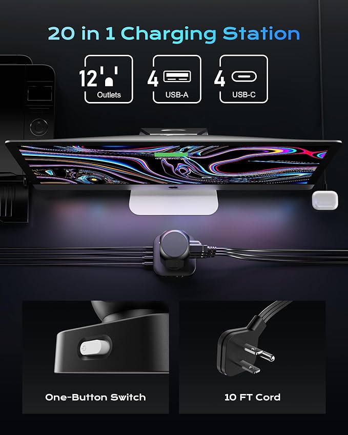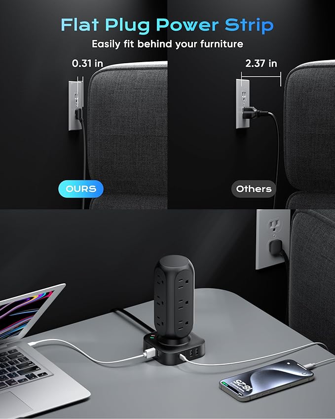 - 【20 IN 1 Power Strip Tower with USB】- This vertical power strip with USB ports features 12 AC outlets and 8 smart-charging USB ports(4 USB-C). It can charge 20 devices simultaneously without blocking, keep your desktop organized, widely use in home/office/dorm room. (Note: Please do not exceed the rated power 1875W ).