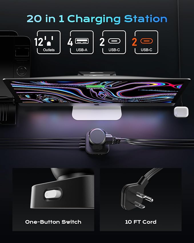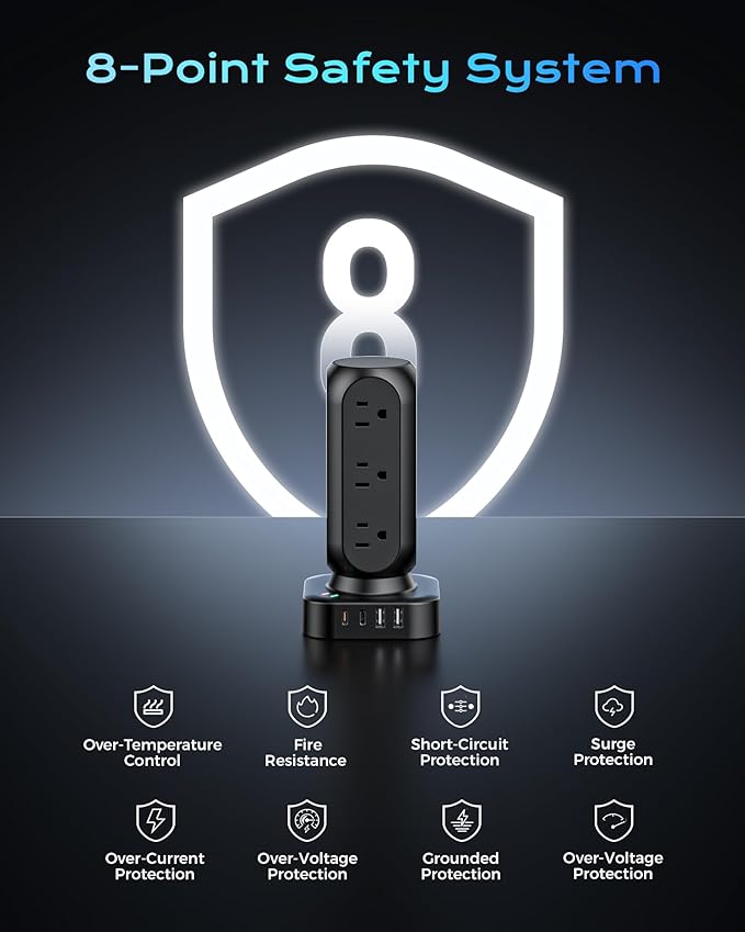 - 【20 IN 1 Power Strip Tower with USB】- This vertical power strip with USB ports features 12 AC outlets and 8 smart-charging USB ports(2 PD 20W USB-C).It can charge 20 devices simultaneously without blocking, keep your desktop organized, widely use in home/office/dorm room. (Note: Please do not exceed the rated power 1875W ).