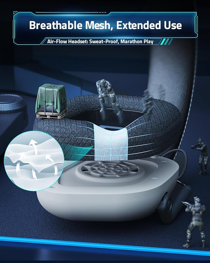 - ใ๐๐ข๐ ๐ก๐ญ๐ฐ๐๐ข๐ ๐ก๐ญ ๐๐จ๐ฆ๐๐จ๐ซ๐ญ, ๐๐ฅ๐จ๐ฐ๐ข๐ง๐ ๐๐๐ฌ๐ฌ๐ข๐จ๐ง๐ฌใUltra-lightweight gaming headset (only 8.8 ounces) delivers limitless comfort for long sessions. Soft, breathable mesh ear pads keep you cool and stuffiness-free, even during intense gaming marathons. Stylish breathing lights add personality, casting a sleek glow to elevate your dark-mode gaming experience