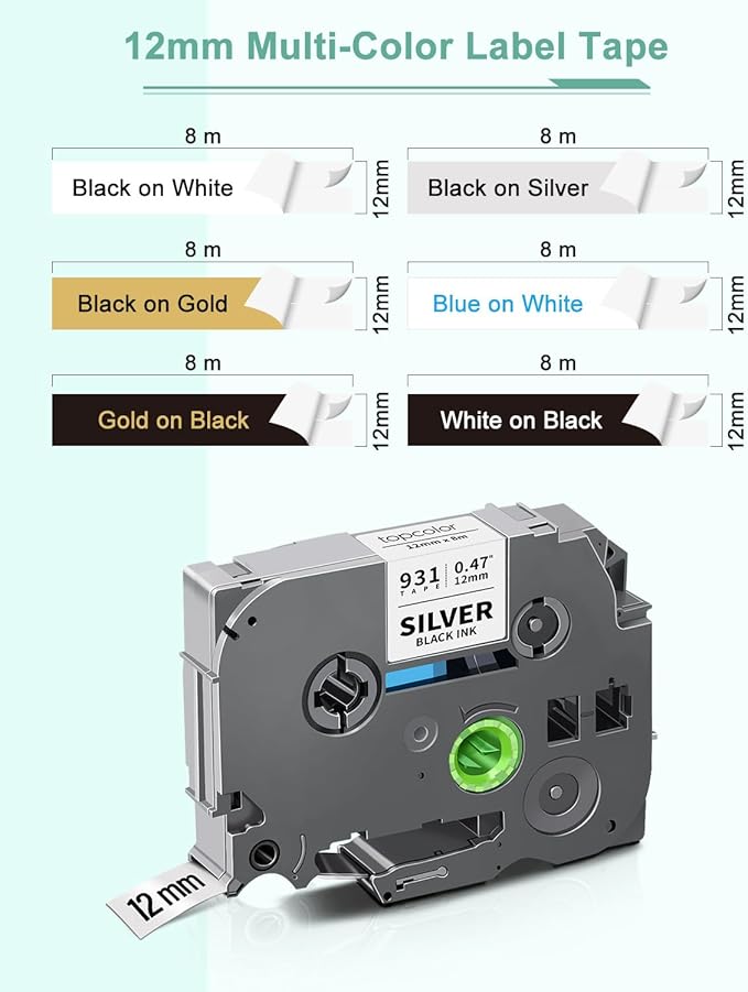 - Package Content: 6 Pack 12mm 0.47" label tape refills compatible for Brother p touch tape tze tz 12mm 0.47" laminated Tze931 Tze831 Tze233 Tze334 Tze335. Size: 0.47 inch x 26.2 feet ( 12mm x 8m ). Color: Black on White / Silver / Gold, Blue on White, Gold on Black, White on Black
