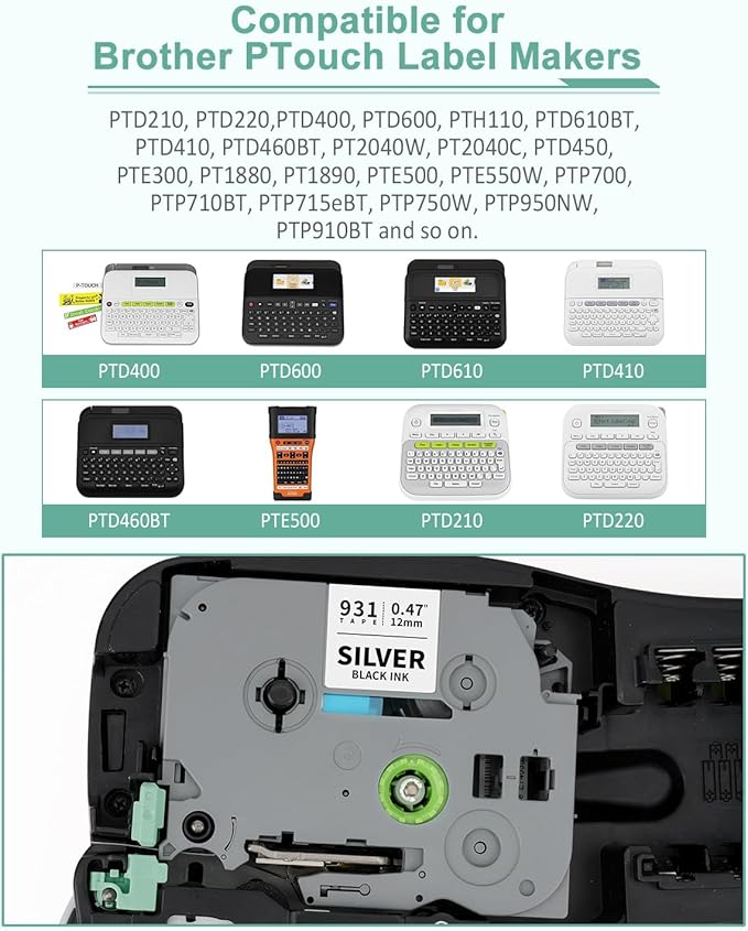 - Compatible with P touch Tze 12mm Label Makers: PTD220 PTD200 PTD201 PTD202 PTD210 PTD215e PTD410 PTD610BT PTD400 PTD400AD PTD400VP PTD450 PTD600 PTD600VP PTD800W PTE100 PTE105 PTE110 PTE300 PTE500 PTE550W PTE800W PTH100 PTH103W PTH105 PTH110 PTH111 PTH300 PTH300LI PTH500 PTH500LI PTP300BT PTP700 PTP710BT PTP715eBT PTP750W PTP900 PTP900W PTP910BT PTP950NW PT200 PT300 PT300B PT2730 and more