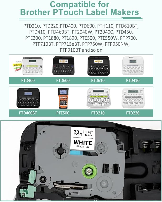 - Compatible with P touch Tze 12mm Label Makers: PTD220 PTD200 PTD201 PTD202 PTD210 PTD215e PTD410 PTD610BT PTD400 PTD400AD PTD400VP PTD450 PTD600 PTD600VP PTD800W PTE100 PTE105 PTE110 PTE300 PTE500 PTE550W PTE800W PTH100 PTH103W PTH105 PTH110 PTH111 PTH300 PTH300LI PTH500 PTH500LI PTP300BT PTP700 PTP710BT PTP715eBT PTP750W PTP900 PTP900W PTP910BT PTP950NW PT200 PT300 PT300B PT2730 and more