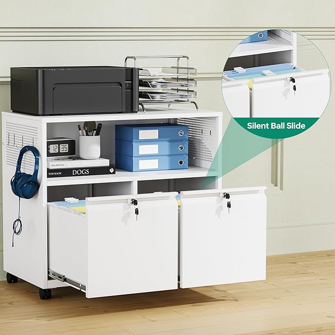 Letaya Mobile 2 Drawer File Cabinet with Lock, Metal Lateral Printer Stand Filing Storage Cabinets with Shelves for Home Office-A4/F4/Letter (White)