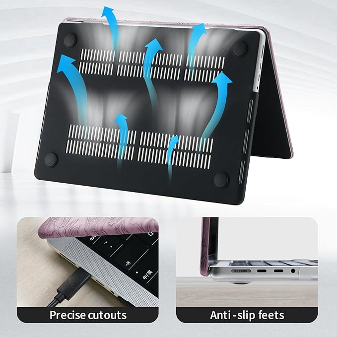 - PREMIUM MATERIAL: Embossed Floral Mac Book Air 13 Case is made from premium, scratch resistance pu leather and impact resistance pc material, the surface is covered with embossed leaves and floral, forming a protective layer similar to "ultra-thin armor", it can effectively protect your device from fingerprints, scratches, shocks, dents and other damages. Coming with silicone keyboard cover to prevent keyboard from food crumbs, liquid spills and key wear