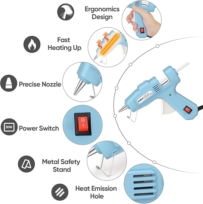 - [EASY TO USE] The handle is ergonomically designed to ensure comfort even during extended use. The operation is very simple, just insert the glue stick into the hot glue gun, gently press the trigger to preheat for 2-3 minutes, and then release the melted glue. Start your DIY now!