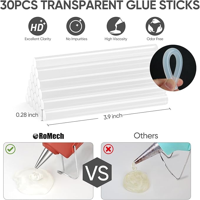- [RAPID HEATING & SAFETY] ROMECH Mini glue gun offers quick preheating in just 2-3 minutes and comes bundled with 30 glue sticks (0.28"/7mm diameter), providing an ample supply for your instant crafting or repair needs. The CE-certified hot glue gun has a built-in security fuse that prevents overheating and ensures safe use.
