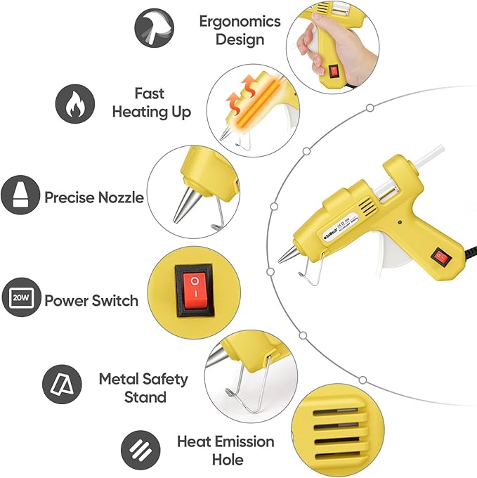 - [EASY TO USE] The handle is ergonomically designed to ensure comfort even during extended use. The operation is very simple, just insert the glue stick into the hot glue gun, gently press the trigger to preheat for 2-3 minutes, and then release the melted glue. Start your DIY now!