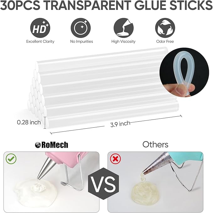 - [RAPID HEATING & SAFETY] ROMECH Mini glue gun offers quick preheating in just 2-3 minutes and comes bundled with 30 glue sticks (0.28"/7mm diameter), providing an ample supply for your instant crafting or repair needs. The CE-certified hot glue gun has a built-in security fuse that prevents overheating and ensures safe use.